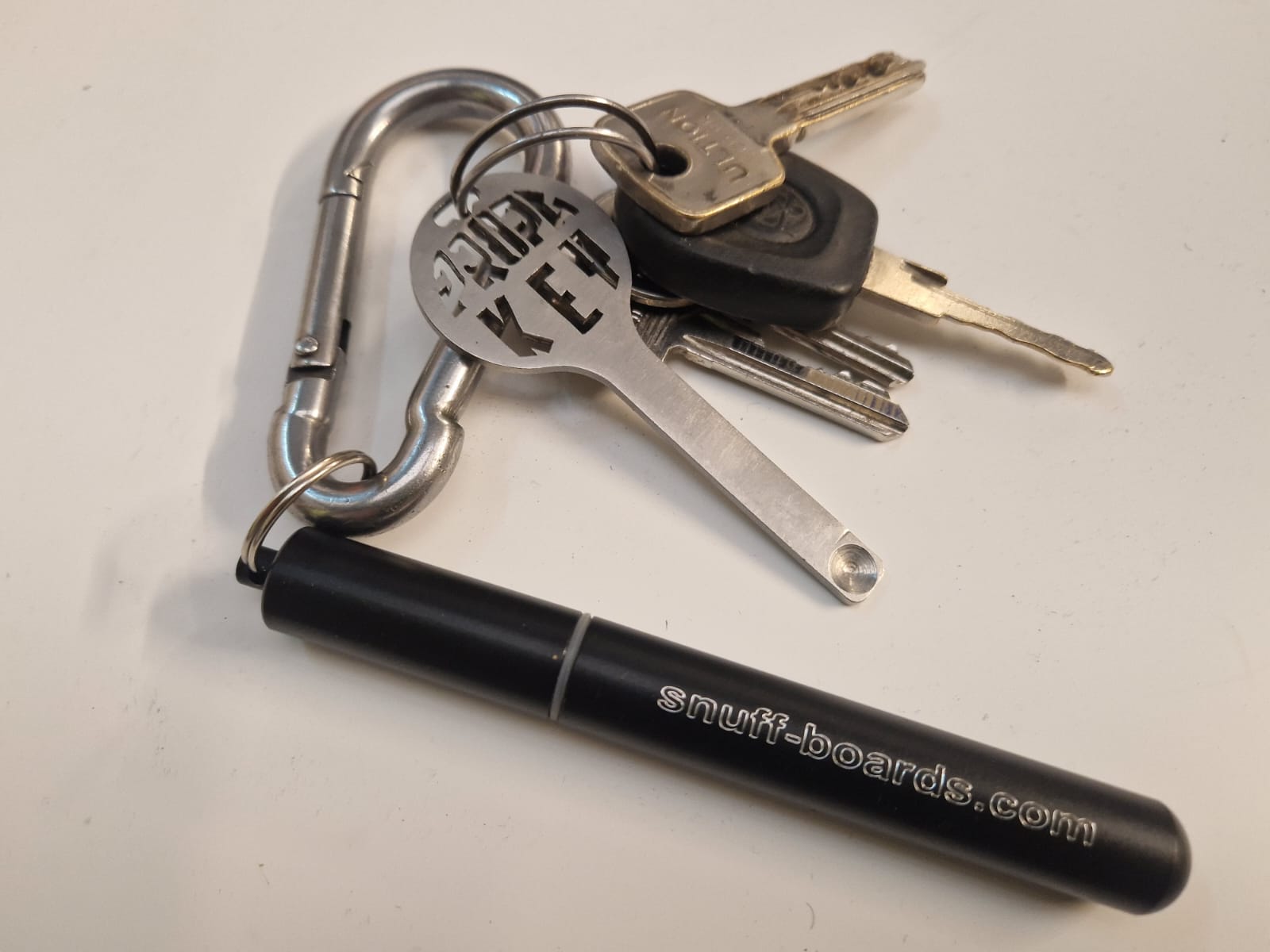 Supplied with an aluminum case as pictured, a lanyard and engraved with the Snuff-Boards logo.